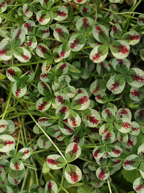 Grey trifoliate foliage with green centres and a feathered maroon-red markings - spectacular in June and July and good at other times of the year. Matching maroon marked white flowers Jun-Aug(Oct), creeping 15cm high. Good cascading out of a pot.