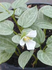 White flowers with a few pale pink speckles Mar-May, olive-green leaves with attractive paler veins like a good cyclamen, 10cm. Gritty humus soil in shade.