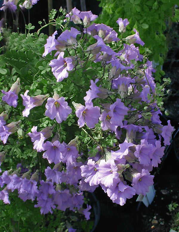 Broad attractively chubby mauve-pink flowers in waterfalls each flower lined with maroon in an entrancing pattern Apr-Jun, slender aestivating climber to 1m.