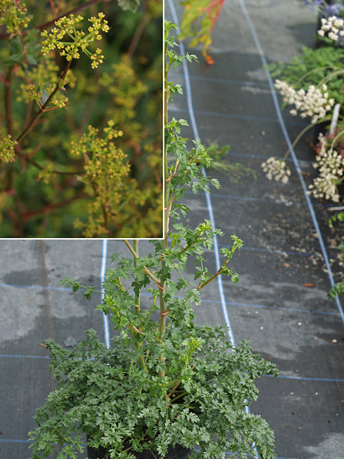 Dark green pinnate foliage the pinnae pinnatifid, unusually leafy up the flowering stem, small heads of greenish flowers Aug-Oct, 60cm.