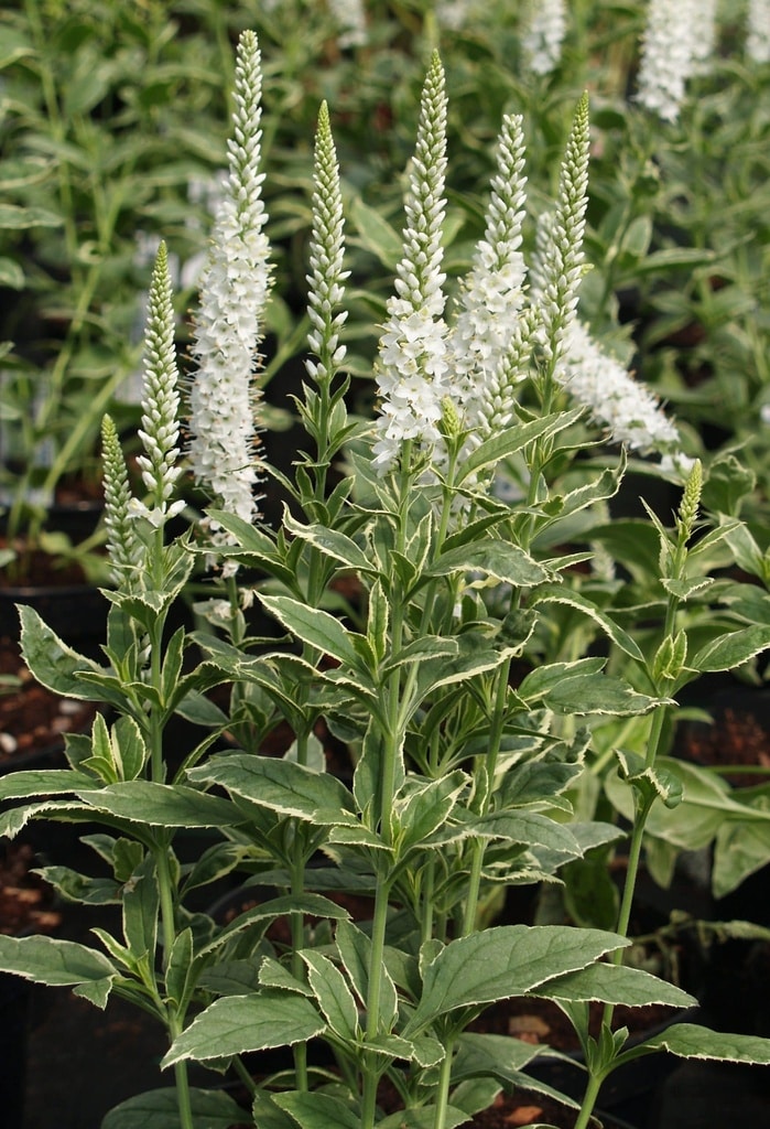 Grey-green foliage edged white, long thick white flowers Jun-Aug, 65cm. Cut back for a later flush of flowers. Like many marginal chimeras it is mildew resistant because the fungus can find no nutrients. PVR - propagation for resale prohibited.