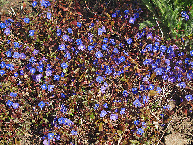 Large blue flowers in spikes (Oct)Mar-May then intermittently, dark reddish leaves. Neat spreader, 15cm. Easy but more flowers and more highly coloured foliage in drier sunny places.