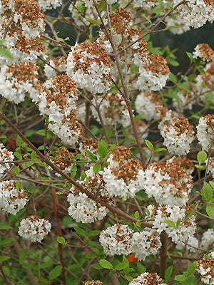 Heads of white flowers Sep-Nov (although it flowers in spring in cold winters), compact 1.5m. Flowers badly frosted May 2010.