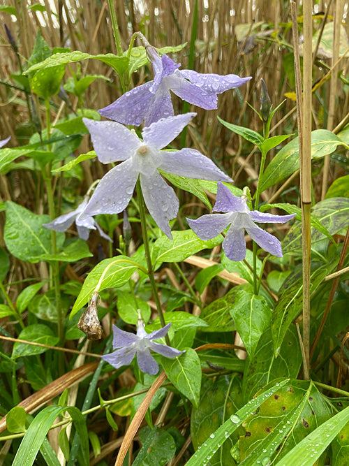 Large pale smokey violet whirly flowers Oct-Dec(Mar), glossy deep evergreen foliage with paler venation, 35cm. Sardinia.