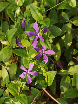 Whirligig blue flowers Mar-Jul, evergreen leaves, spreader (lovely climbing through a hedge). Easy.