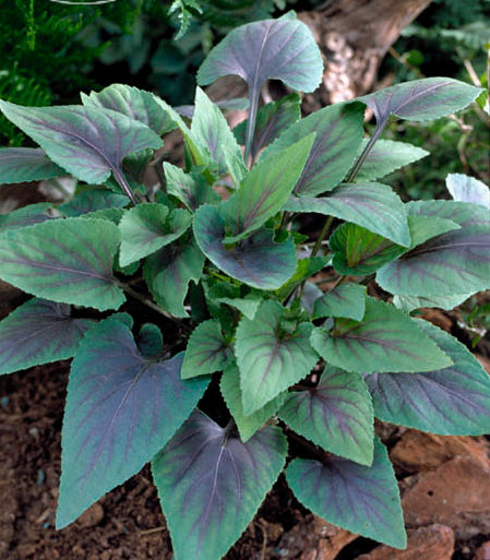 Derived from V.hirtipes f.rhodovenia x V.japonica. Large black-centred red-black pointed leaves with red veins and green margins, white flowers Apr-May, 20cm.