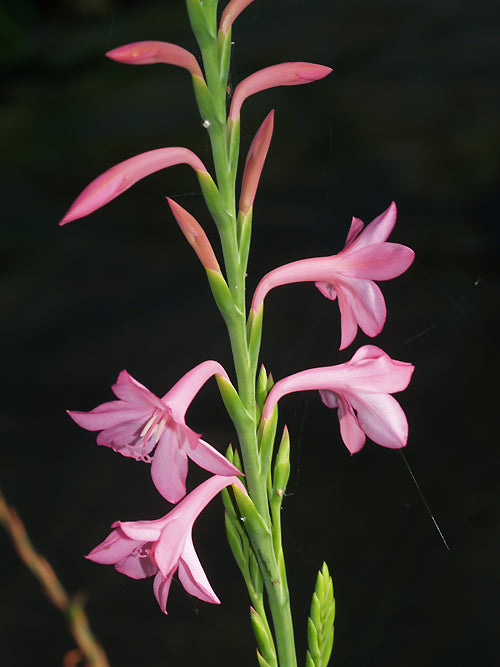 Strong pink flowers in neat two-sided spike Jul-Sep, 40cm. hardier than most because it overwinters as a bulb.