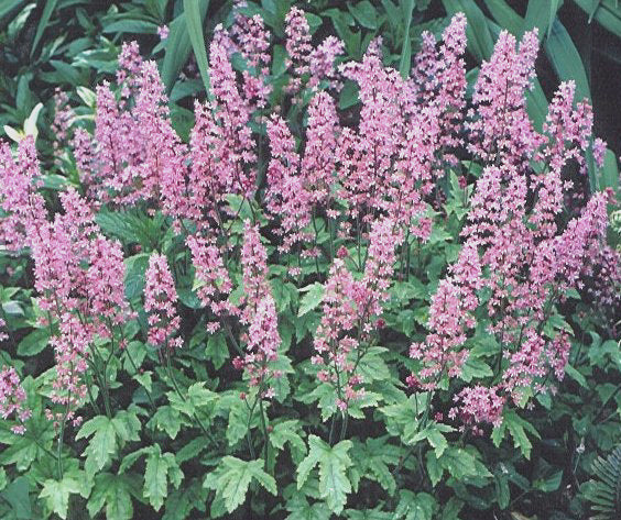Silvered maple-shaped foliage and branched deep coral-pink flower heads which because the plant is sterile continue to bloom Apr-Oct, 40cm. Easy even dryish shade under trees. Plant Patents USA 12029, Europe 9997 - propagation for resale prohibited.