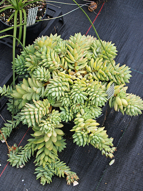 Impressive thick tassles of evergreen pink and grey succulent leaves and yellowish flowers Aug-Oct, 35cm. Tender. An intergeneric hybrid between Sedum and Echeveria.